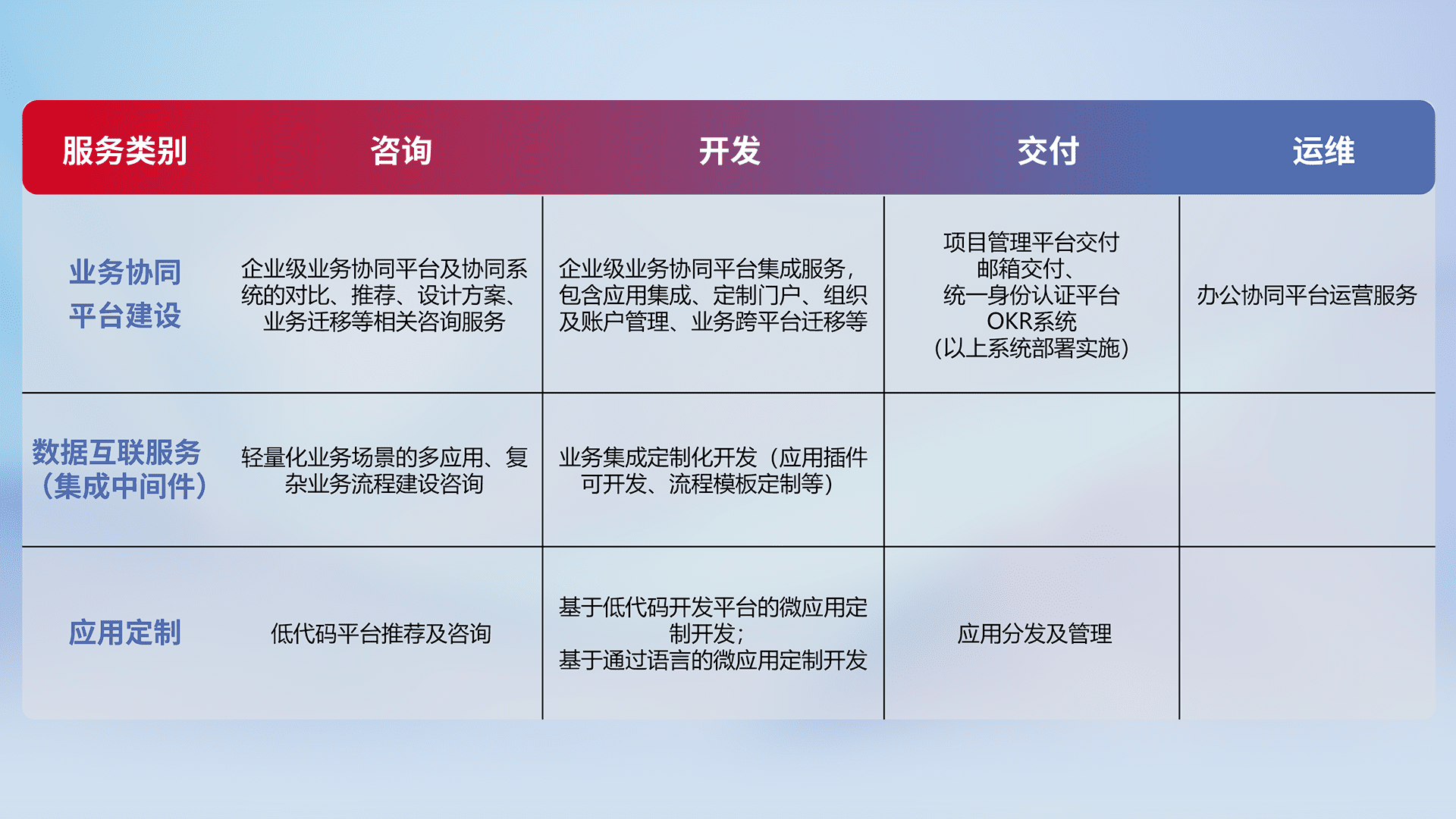 针对钉钉、、、、企微、、IDaas等平台级产品提供产品的规划、、、方案、、、、交付、、定制化开发等服务,,,,实现如统一协同办公、、智能客户服务、、混合会议管理、、智能数据查询、、、等业务场景,,,实现数字化转型。。。。